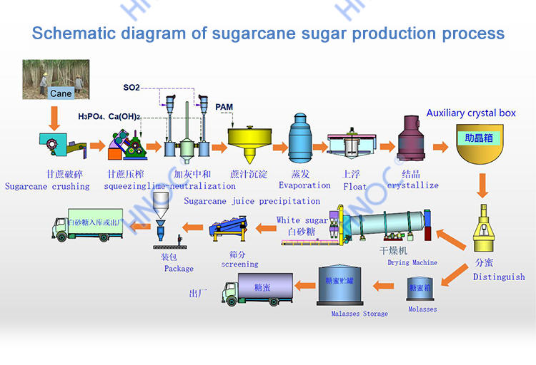 | Key machines: | Fruit and vegetable juicer, sugar pot | Finished goods: | White sugar powder, syrup |