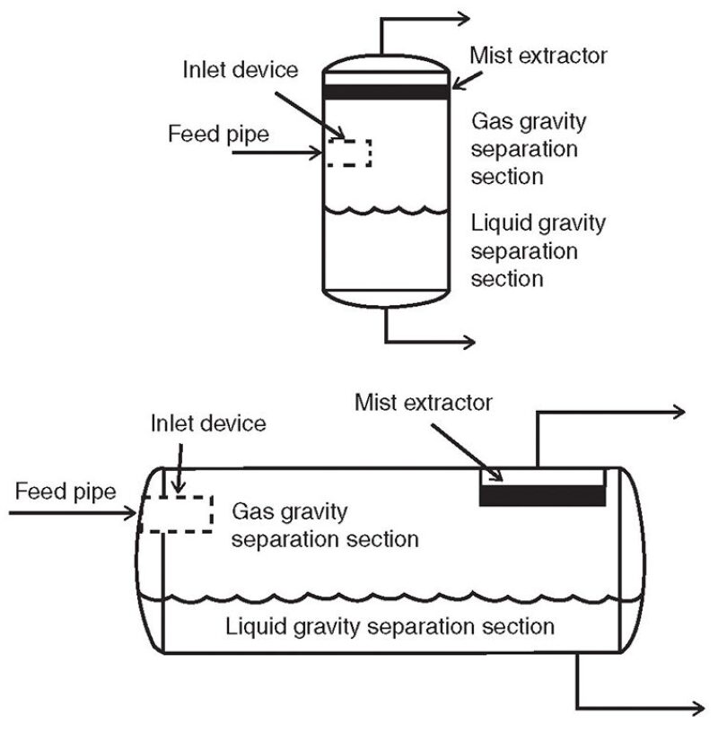 The main components of a typical vertical or horizontal gas-liquid separator are shown in the figure below, including the feed pipe, inlet device, gas gravity separation section, mist eliminator and liquid gravity separation section.