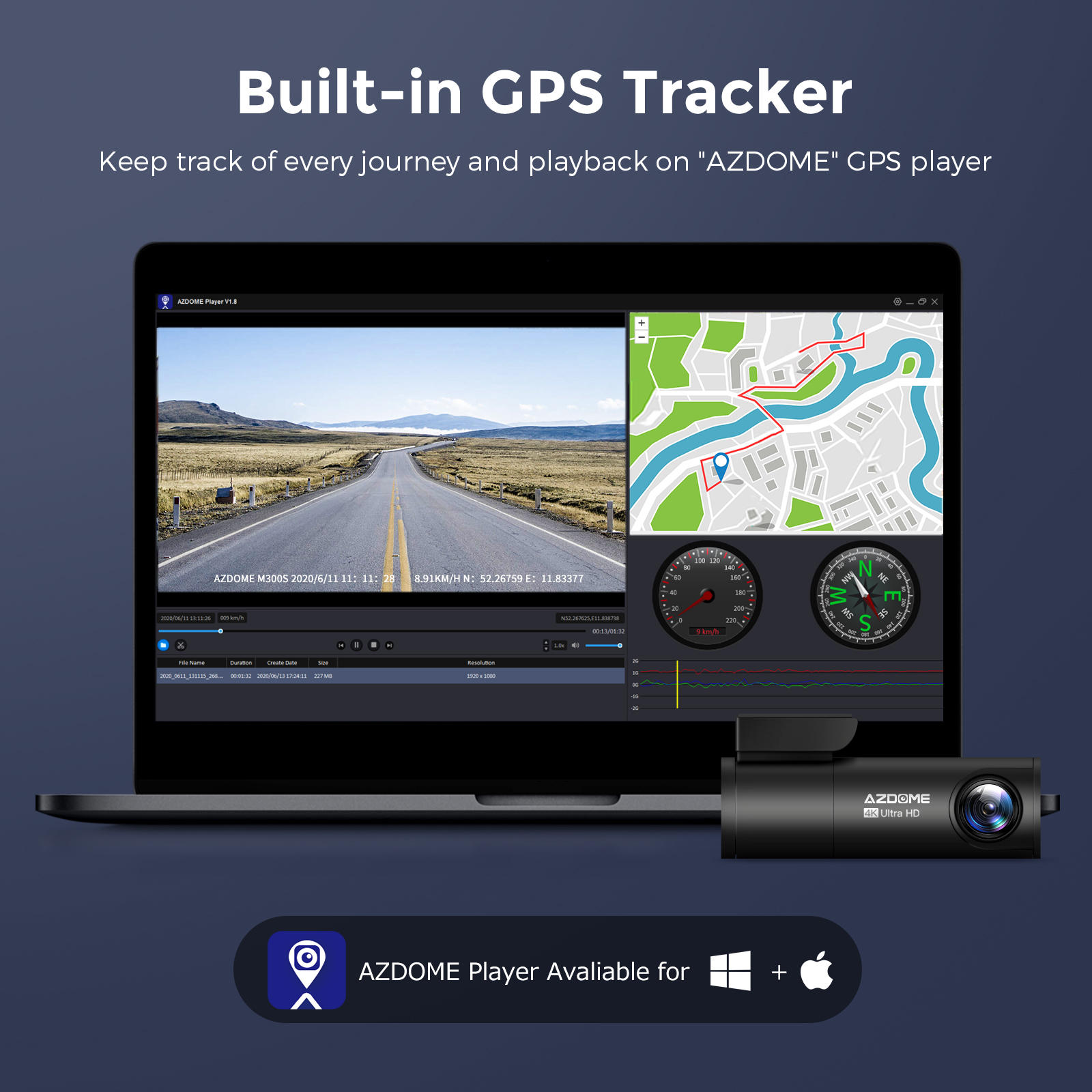 Function | Night vision, G-Sensor, parking mode, loop recording, built-in WiFi, APP control, built-in GPS, emergency lock |