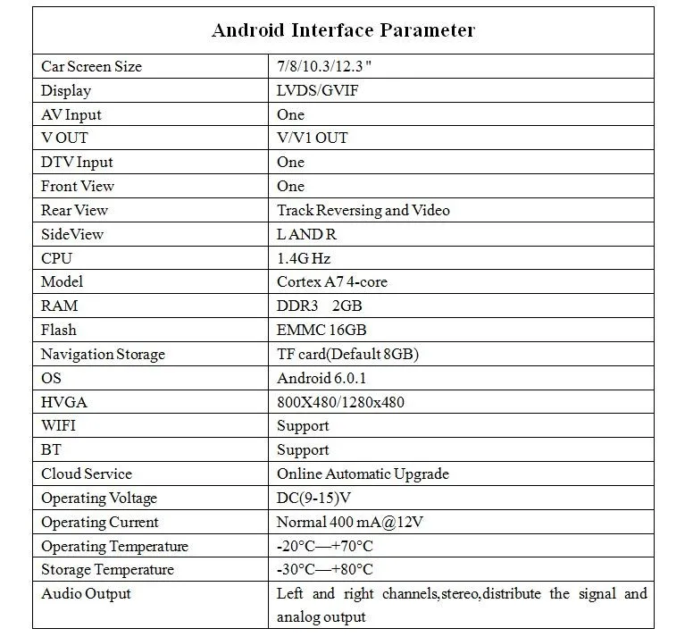 | APP: | download any apps from Google play store and google play; | Function: | Support Rearview Camera; |
