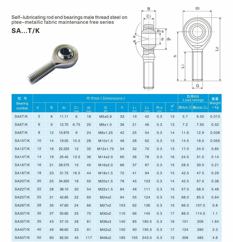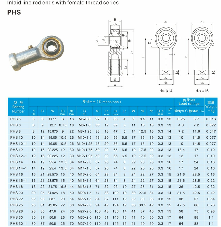 feature:1) Can withstand high loads. Depending on their type and construction, rod ends can support radial loads, axial loads, or both. 2) The spherical outer surface of the inner ring is lined with composite material, which has self-lubricating effect. 3) Rod end bearings have impact resistance due to their large spherical sliding contact area, large inclination angle and special processing methods, such as outer sliding surface coating, galvanizing, chrome plating or lining, spraying, etc. 4) Rod end bearings are corrosion-resistant and wear-resistant. It is also self-aligning and self-lubricating, allowing it to work properly even if it is improperly installed.Technical performance:1) Operating temperature: -30°C~+80°C 2) Inclination angle: 3°~15° (angular contact rod end bearing: 2°~3°; thrust rod end bearing: 6°~9°)application:Generally suitable for low-speed pendulum motion (angular motion). It is widely used in engineering hydraulic cylinders, metal forming machinery, engineering machinery, automation equipment, automobile shock absorbers, water conservancy machinery and other industries.