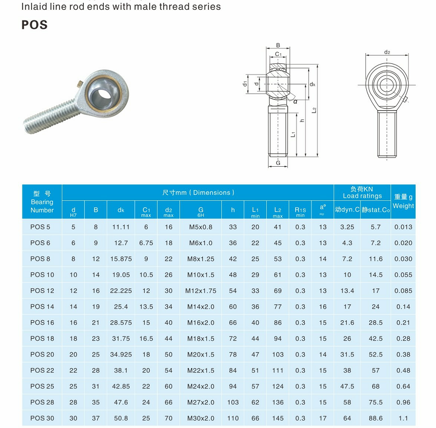 | product name | POS12 POS12A M12 spherical sliding external thread rod end Heim spherical plain bearing |