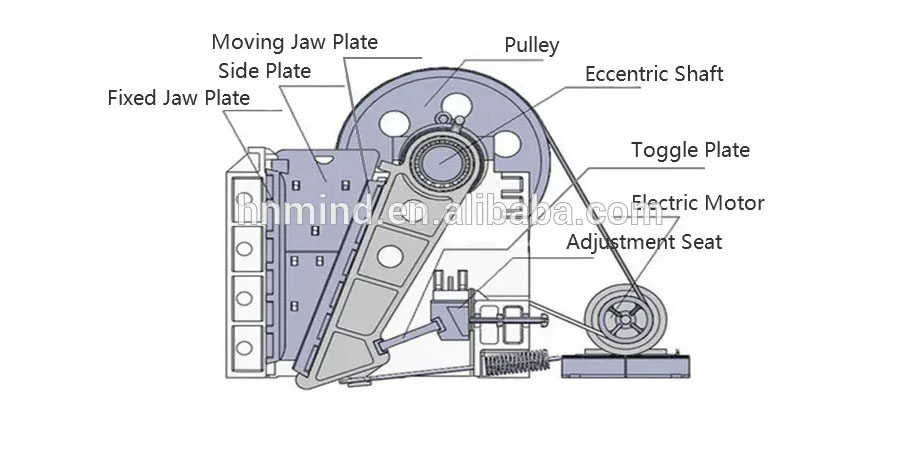 1. The motor drives the belt and pulley, and makes the movable jaw move up and down through the eccentric shaft. When the movable jaw rises, the angle between the bracket and the movable jaw becomes larger, thus pushing the movable jaw closer to the fixed jaw.
