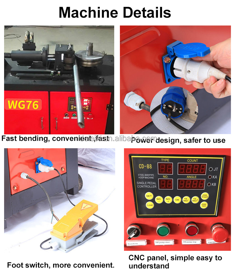 WG-38/51/76 CNC steel pipe bending machine is mainly used to bend different types of pipes, such as round or square low carbon steel pipes, 201 or 304 stainless steel pipes, rectangular steel pipes, aluminum pipes, copper pipes or other special-shaped steel pipes. This machine always bends the pipe into different angles from 5 to 180 degrees.