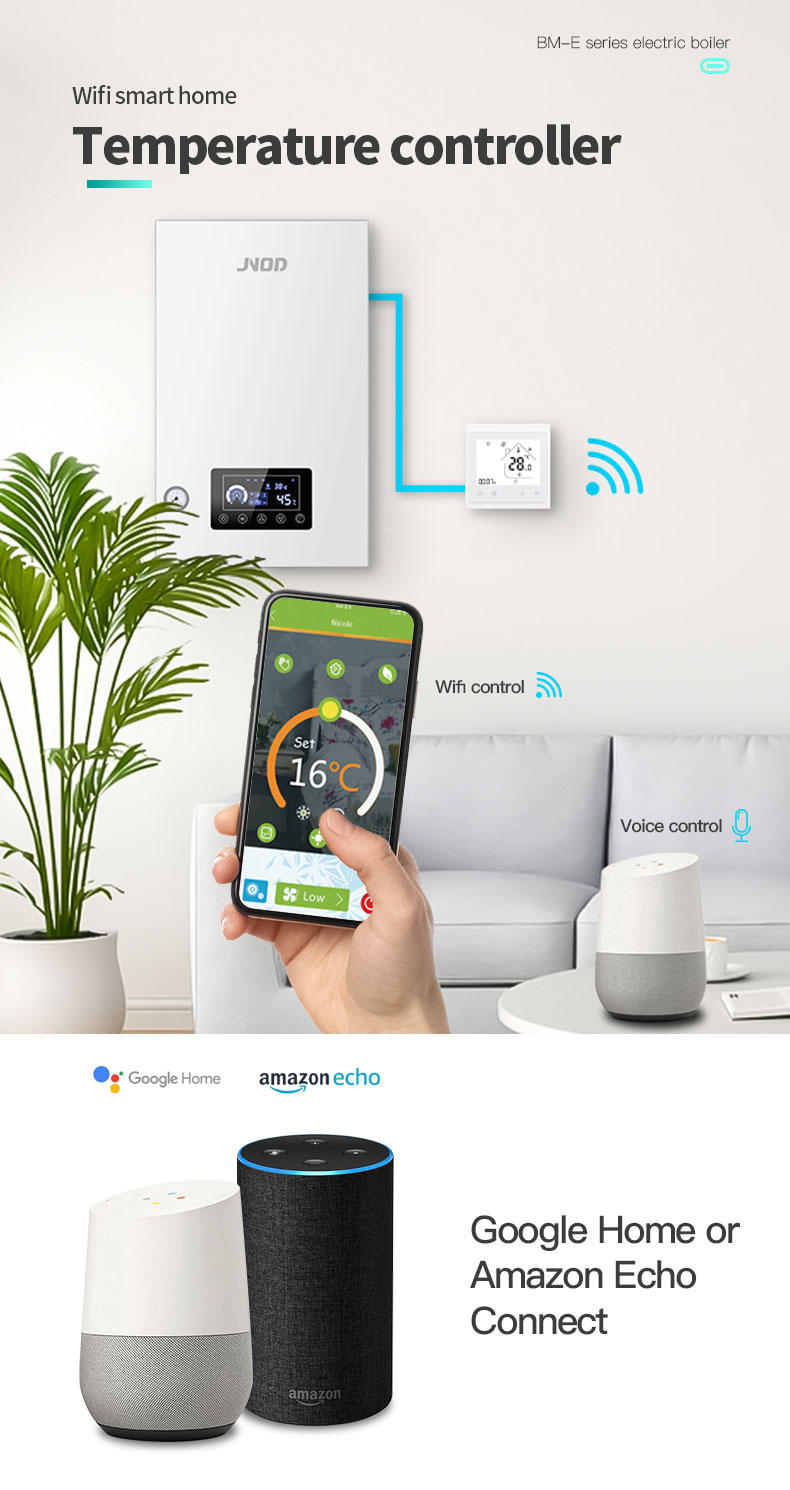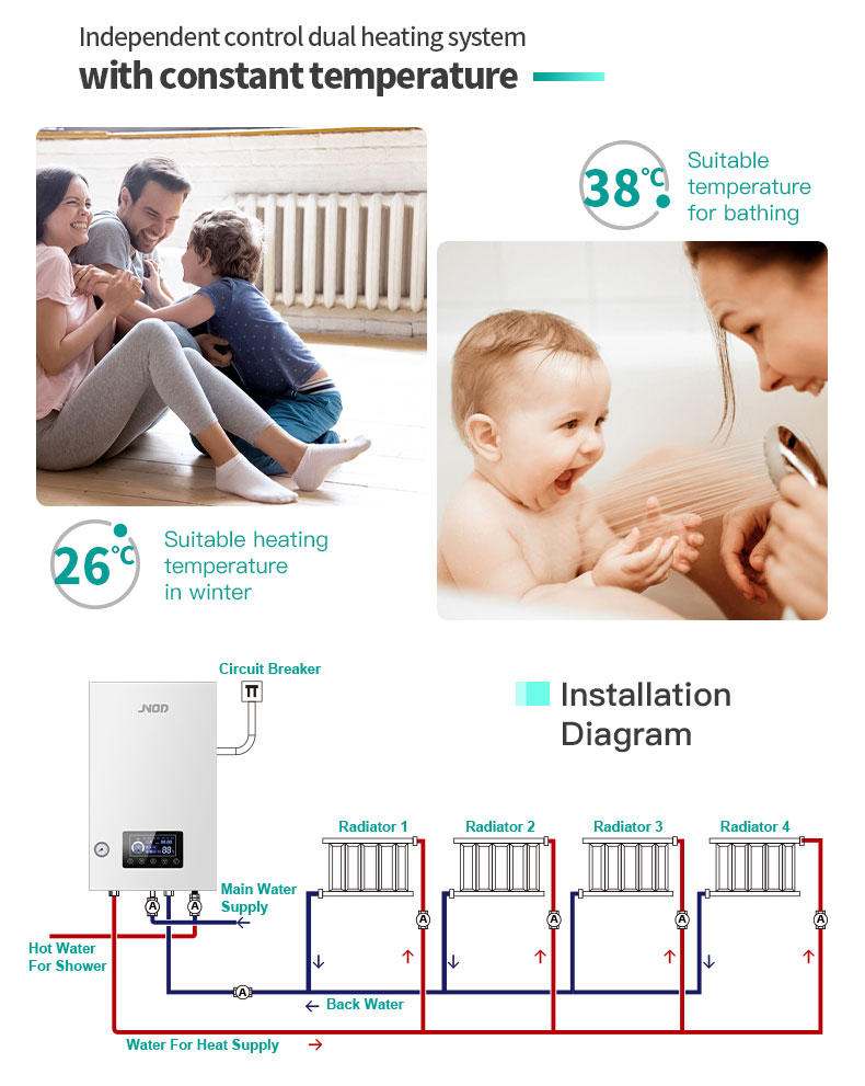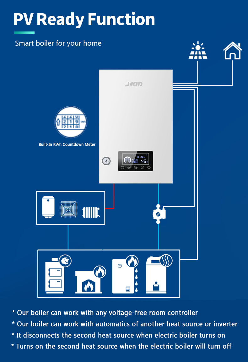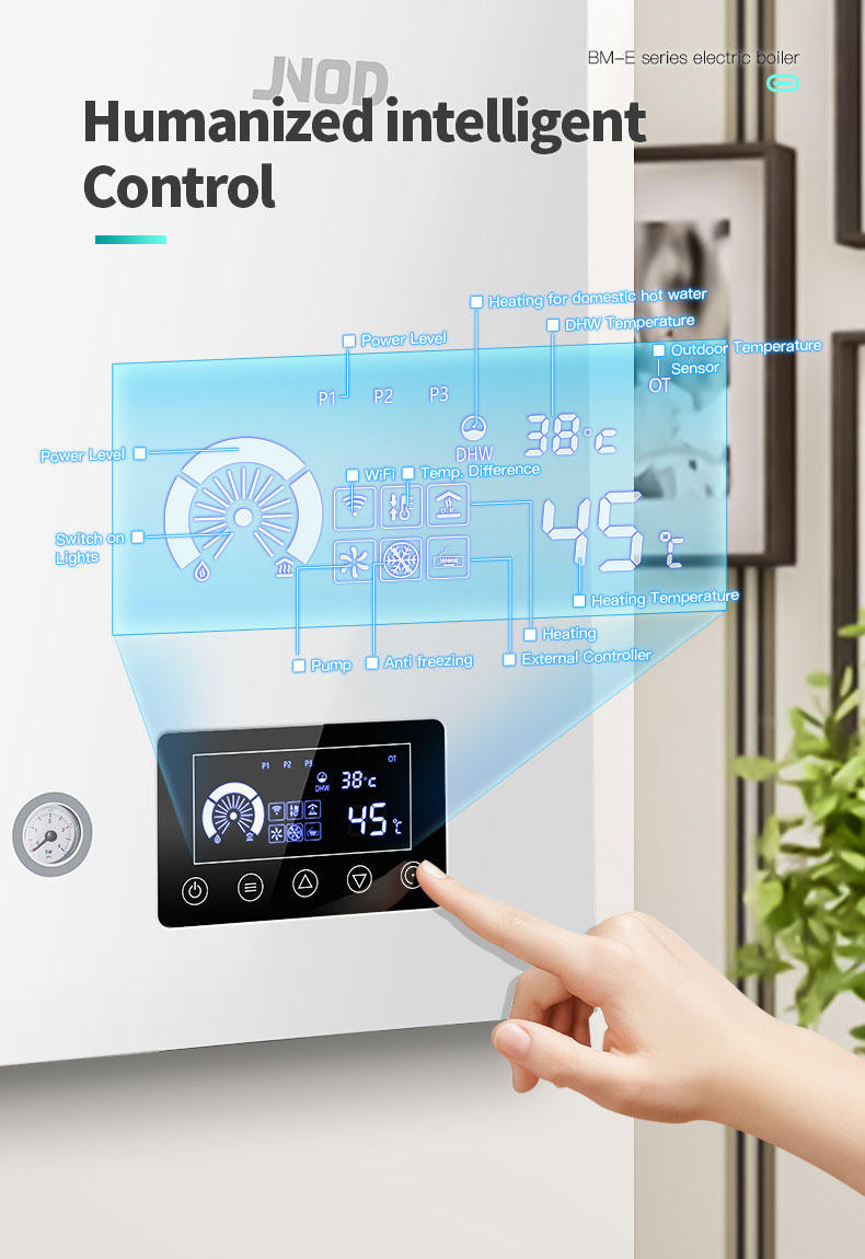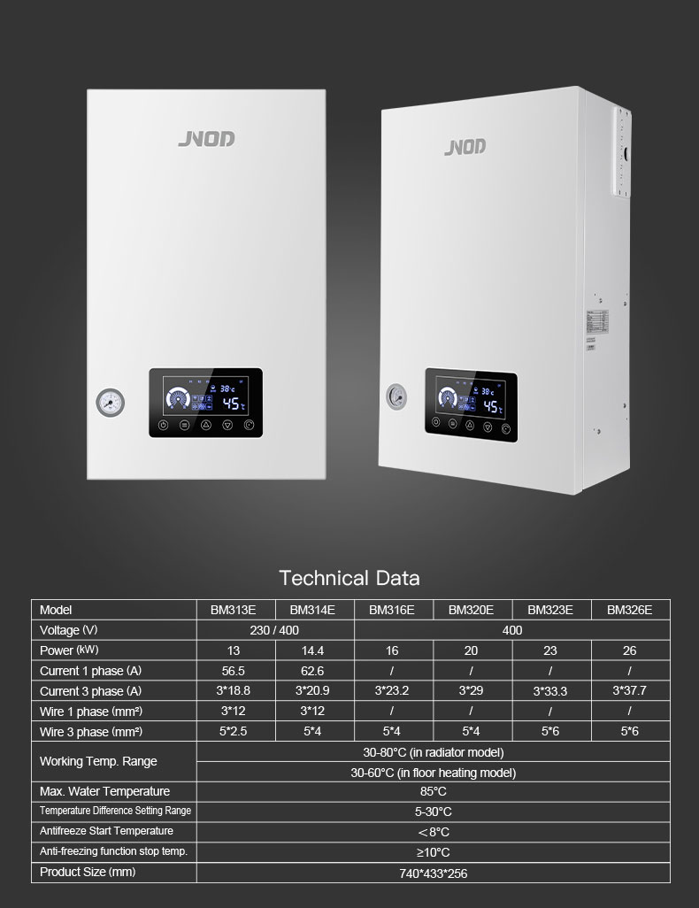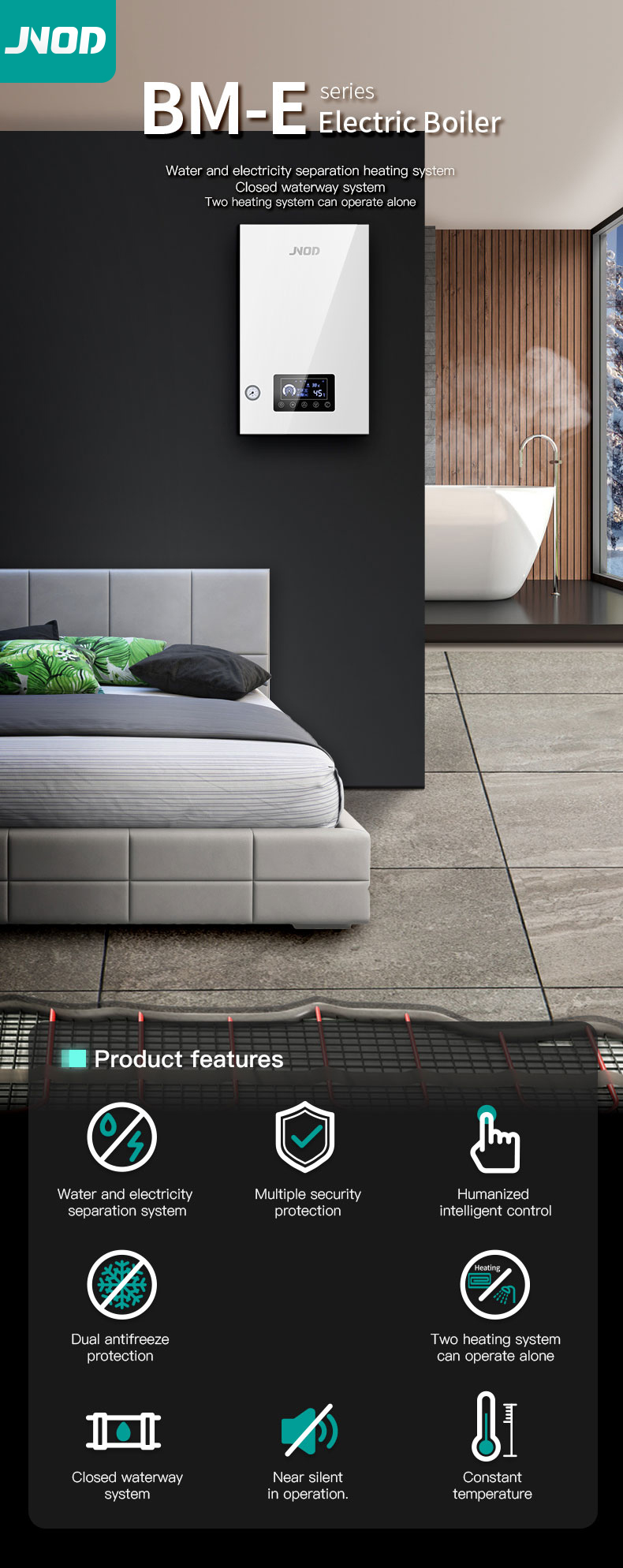 JNOD electric boilers are available in a variety of output ranges and sizes, making them the ideal solution for energy-efficient homes without a nearby gas supply. These devices can be added to new and existing residential systems. Electric boilers require no ventilation or gas connections, making installation quick and easy.