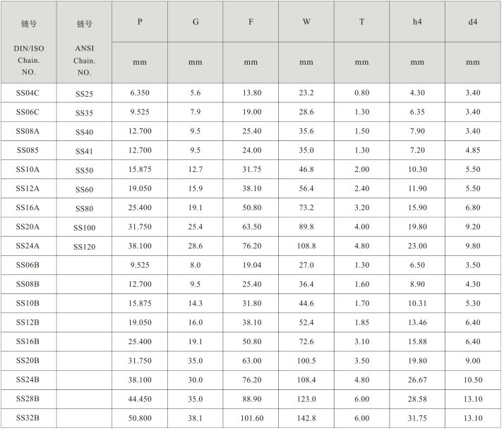 Single row roller chain & sleeve chain: 04C-1, 06C-1, 085-1, 08A-1, 10A-1,12A-1,16A-1,20A-1,24A-1,28A-1, 32A-1,36A-1,40A-1,48A-1