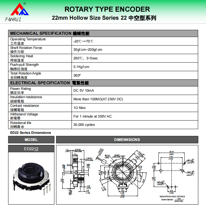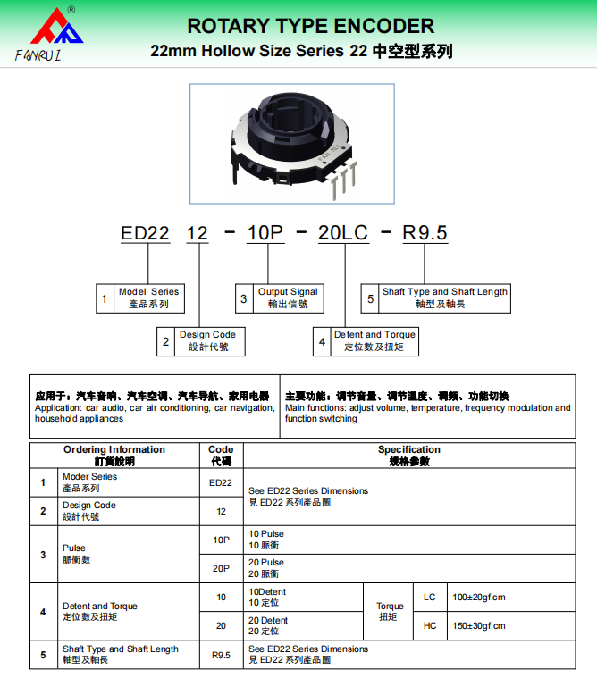 Dongguan Fanrui Electronic Technology Co., Ltd. was established in 2009. It is a manufacturer specializing in the design, manufacturing, production and sales of encoders, potentiometers, multi-way switches and smart home modules. The company has its own registered trademark. Products are widely used in automotive electronics, multimedia, mixers, walkie-talkies, electronic toys, household appliances, 3C fields and industrial equipment. The products are sold at home and abroad, comply with RoHS requirements and meet environmental protection standards.