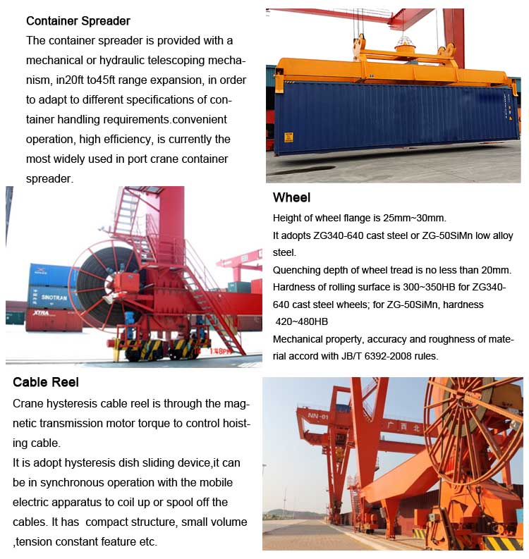 1.1Rail-mounted Small Rail Container Large Span 35 Ton Gantry Crane The rail-mounted crane for sale is a rail-mounted crane used for unloading, stacking and loading 20-foot, 40-foot, and 45-foot ISO standard containers. Its power supply is provided by a cable drum. The crane consists of three mechanisms: lifting, trolley operation and mast operation. The trolley runs along a track mounted on the gantry beam and can run between the legs. The crane can move straight along the track.