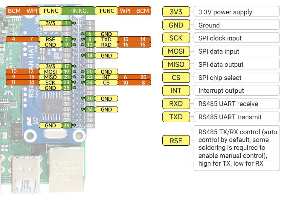 CAN functionality, onboard CAN controller MCP2515 via SPI interface, onboard transceiver SIT65HVD230DR