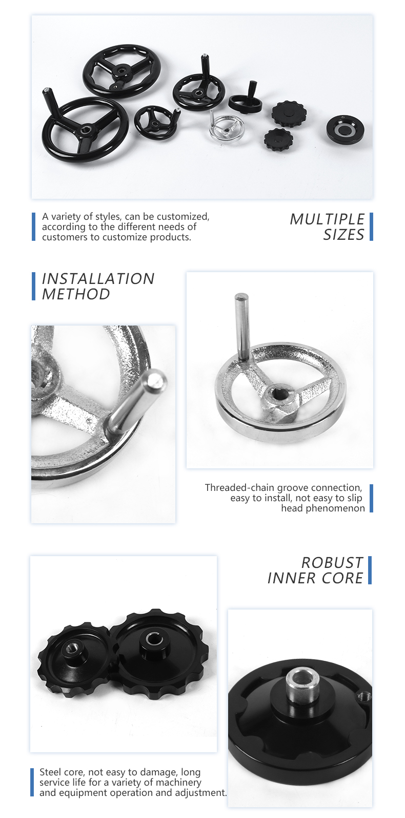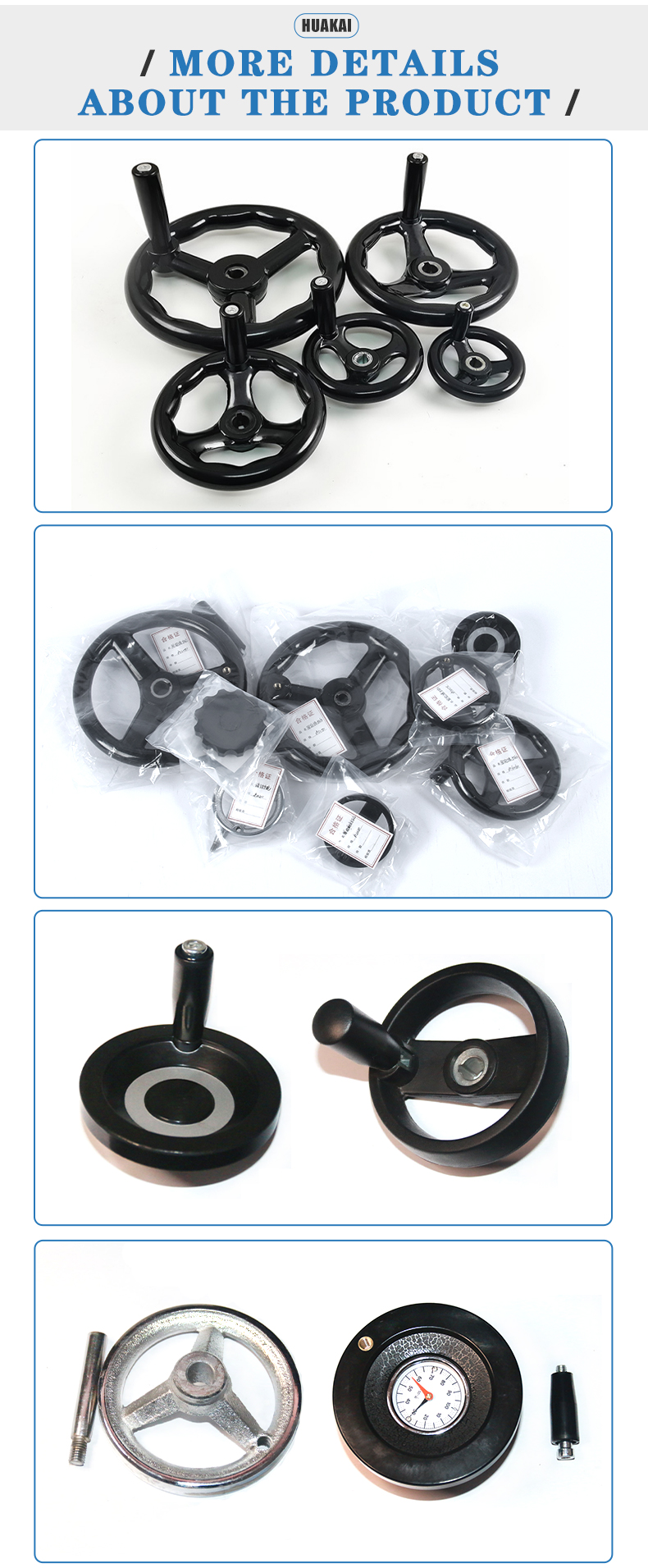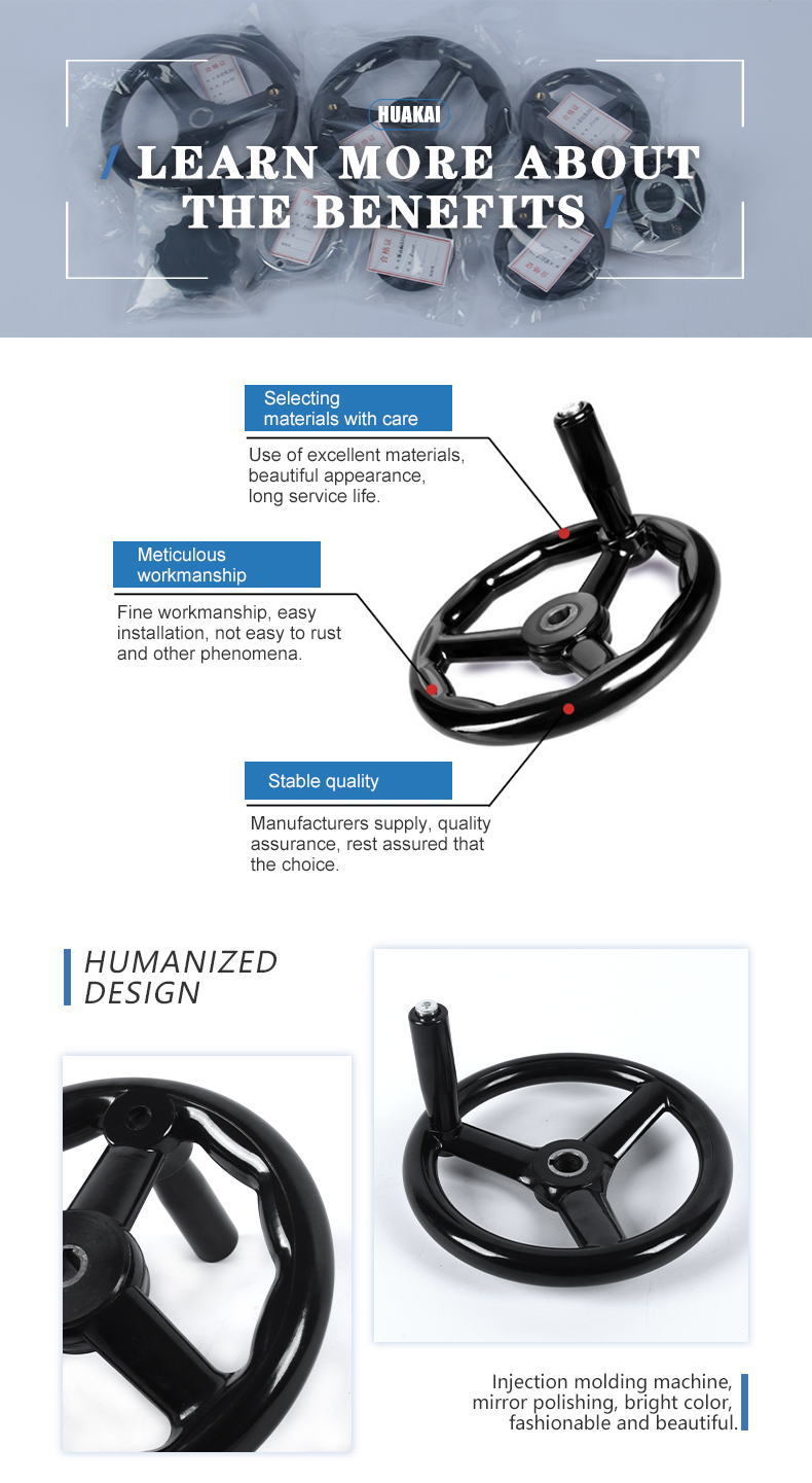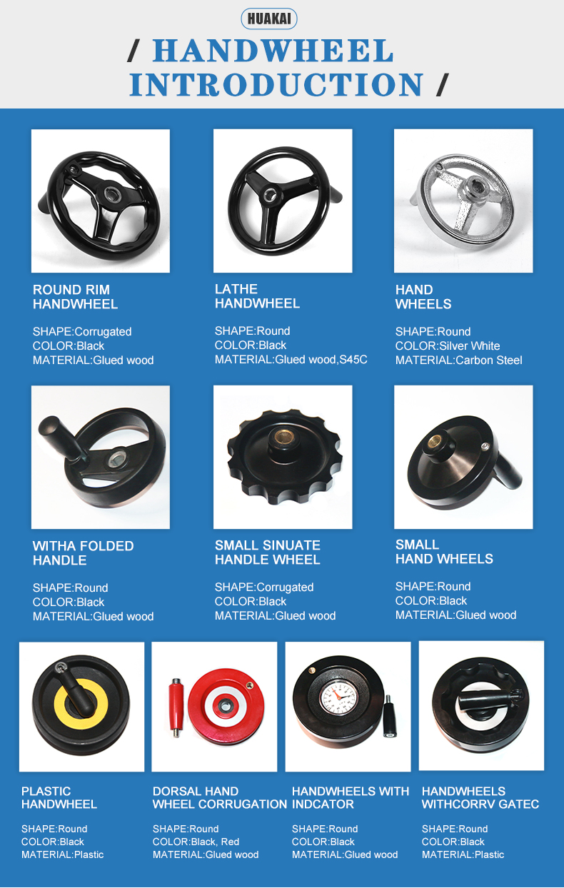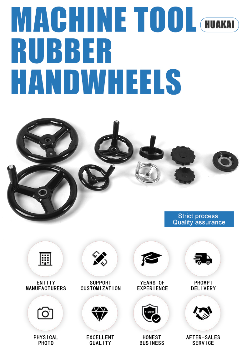 Huakai Machinery Parts Factory has been committed to technological innovation and management innovation since its operation. After years of product development, its main products are: corrugated handwheel, double-width handwheel, echo handwheel, circular handwheel, double-width R handwheel. , double handle handwheel, wavelet handwheel, E bed handwheel, corrugated handwheel, flat handwheel, with folding handle, picture full handwheel, ball handwheel, long handle cover, rotating handle, adjustable sleeve, folding rocker Rod, star-shaped, dish-shaped rocker, oval handle cover, five-pointed star handle, triangular arrow handle, cross handle, embossed handle, hole handle, straight handle, T handle, pinch handle, triangular handle handle cover , small rotating handle, ball head handle, press-fit oil mark, screw-in hexagonal round oil mark, round long handle, square handle, oval handle, bow handle, various rubber seals, chlorine crushing chemical machinery accessories, etc.
