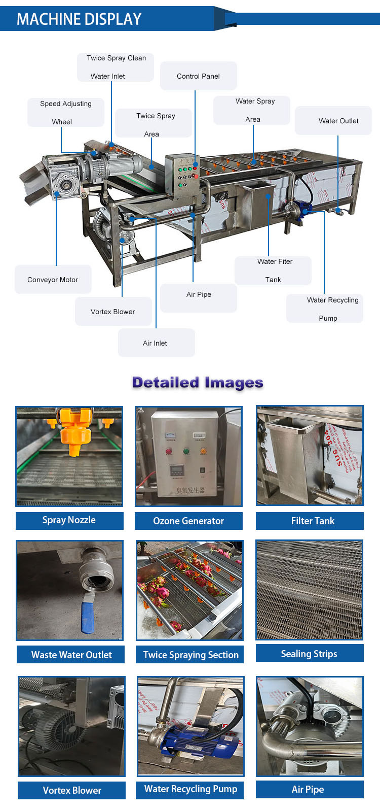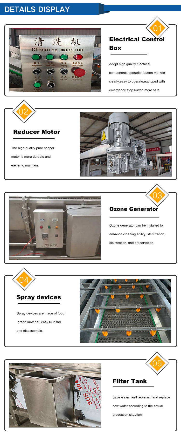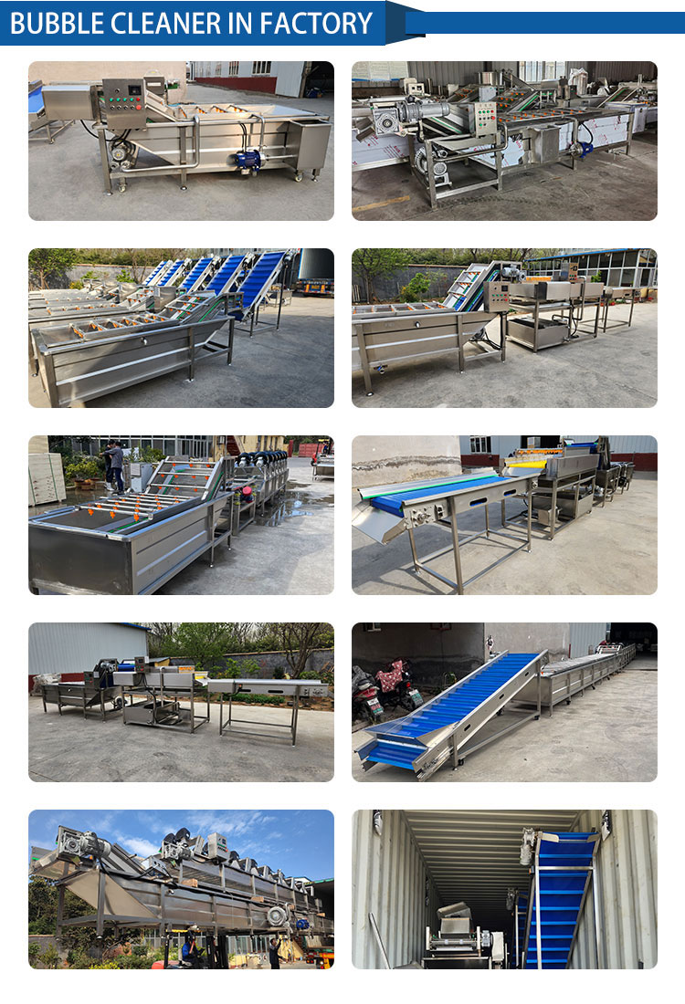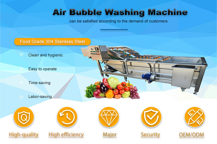 Introduction to washing machineExcept for standard parts such as motors and bearings, the equipment is made of stainless steel SUS304, which fully complies with export food hygiene requirements. The equipment is equipped with a bubble generating device to keep the material in a tumbling state to remove pesticide residues on the product surface. At the same time, an appropriate amount of medicine can be added for disinfection and fixation. Floating objects can overflow from the overflow tank, and sediments can be discharged from the sewage outlet to achieve the purpose of cleaning. Under the combined operation of bubbles, surfing, lifting and spraying, this equipment has the characteristics of high cleanliness, energy saving, water saving, stable and reliable equipment, and maintaining the original color. It is an ideal choice for vegetables, food processing, catering and other industries.