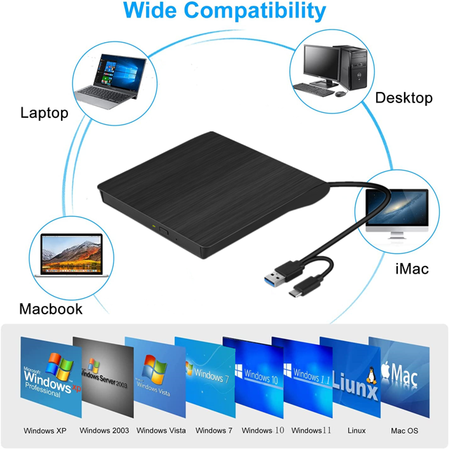 Compatibility DVD driver supports Windows XP, 7/10/11, Linux and Mac OS. (plug and play) | ||||||||