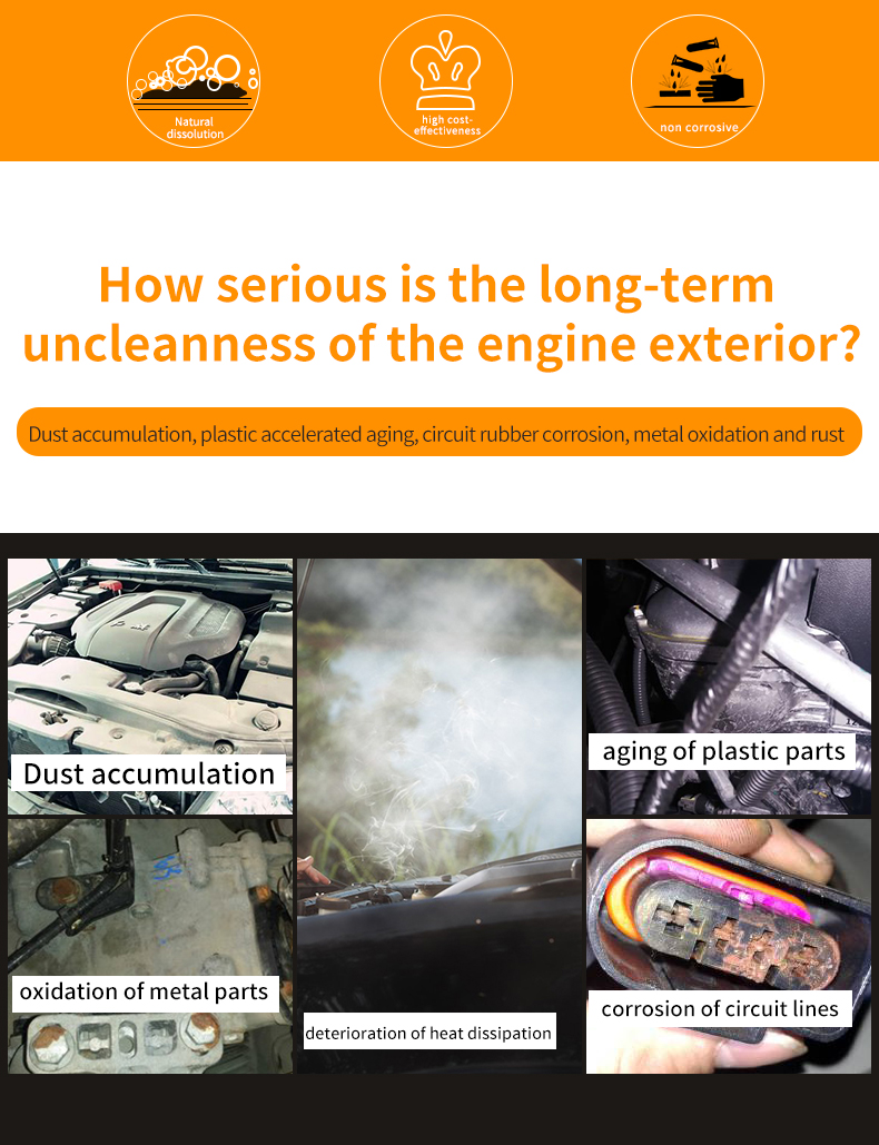 1. Wait for the engine to cool down before cleaning. 2. Spray this product evenly on the outer surface of the engine. 3. Rinse with clean water for 1-2 minutes.