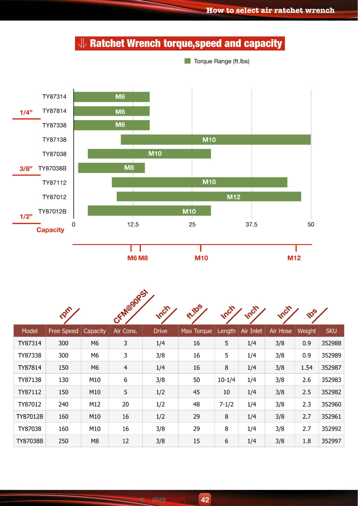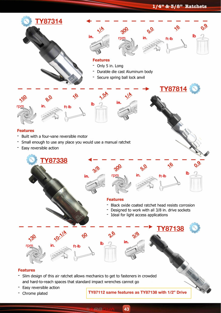 The TY5R114 speeds up automotive projects such as removing and replacing automotive fasteners. The air ratchet is made from a four-blade reversible motor that uses a long-lasting planetary gear reducer and is small enough to be used in any situation where you might use a manual ratchet. This ratchet wrench has a maximum torque of 16 foot-pounds. Top speed is 150 RPM.