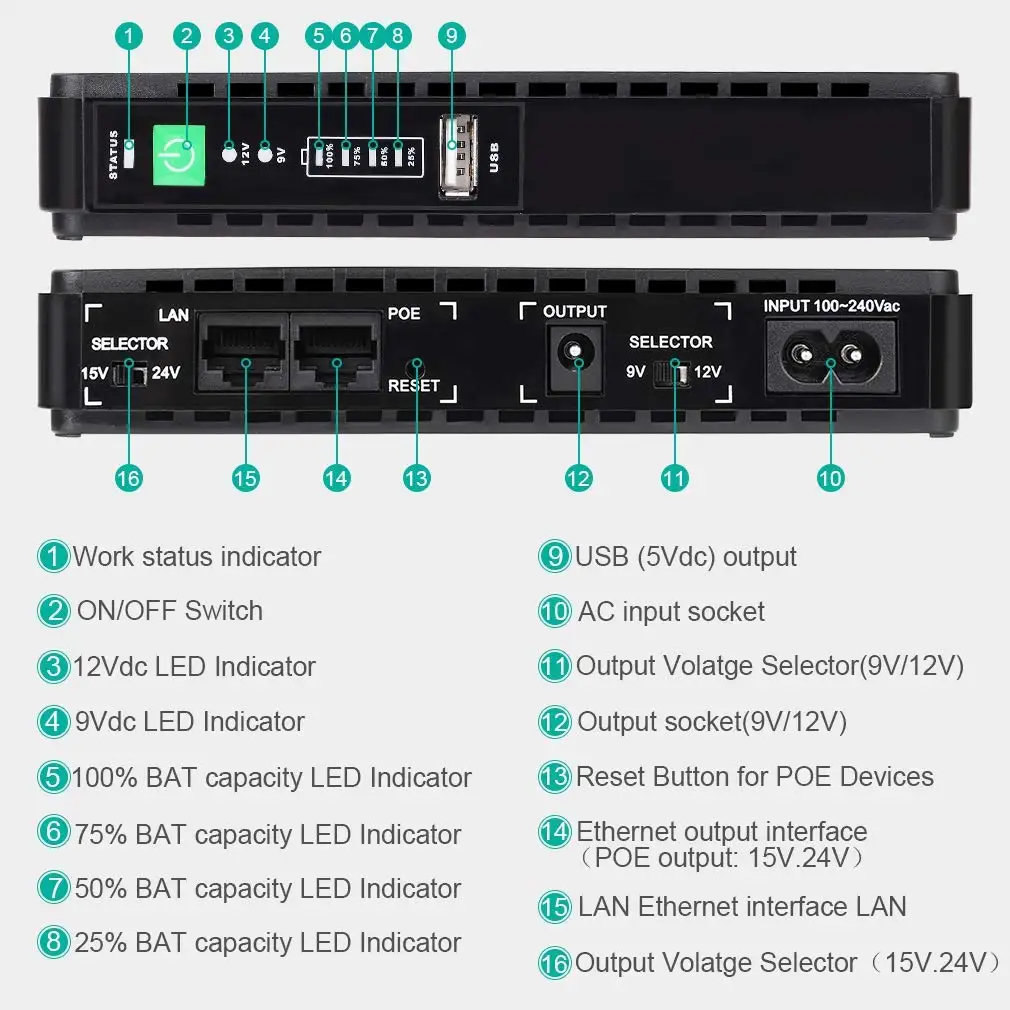 100-240v Mini DC Ups Poe Mini Ups 9v 12v 15v 24v for Router Modem Camera