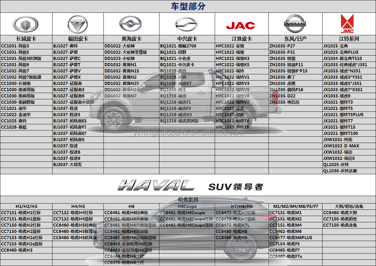 China Pickup/SUV/Hiace Auto, headquartered in Guangzhou, has OEM quality auto parts for D-max/TFR/Hilux/Vigo/Revo/L200/Navara/NP300 and other SUV/pickup models; as well as Great Wall Steed/Fengjun/Puer CC-1031 CC-1030 and other Chinese brands; Great Wall Haval/Haval H3 H5 H6; ZTE BQ-1028, BQ-1035