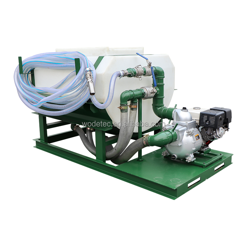 The WHS0110PT is a skid-type jet agitation hydraulic seeder, which is an ideal hydraulic seeder for landscapers with general working areas of 185 square meters to 4000 square meters for residential and commercial seeding. It takes about 15 minutes to spray a full can. Mixing time is 1-20 minutes, depending on materials. Each load can sow 350 square meters. It is equipped with a 13 HP Honda (electric start engine) connected directly to a 4" X 4" high capacity centrifugal pump. The unit also comes with a 60m DN32 discharge hose and 3 nozzles (1 wide hydroseeding nozzle, 1 medium nozzle and 1 straight nozzle with a spraying distance of approximately 28m). They can be mounted on the back of a truck with adequate load capacity or can be easily operated via a trailer.