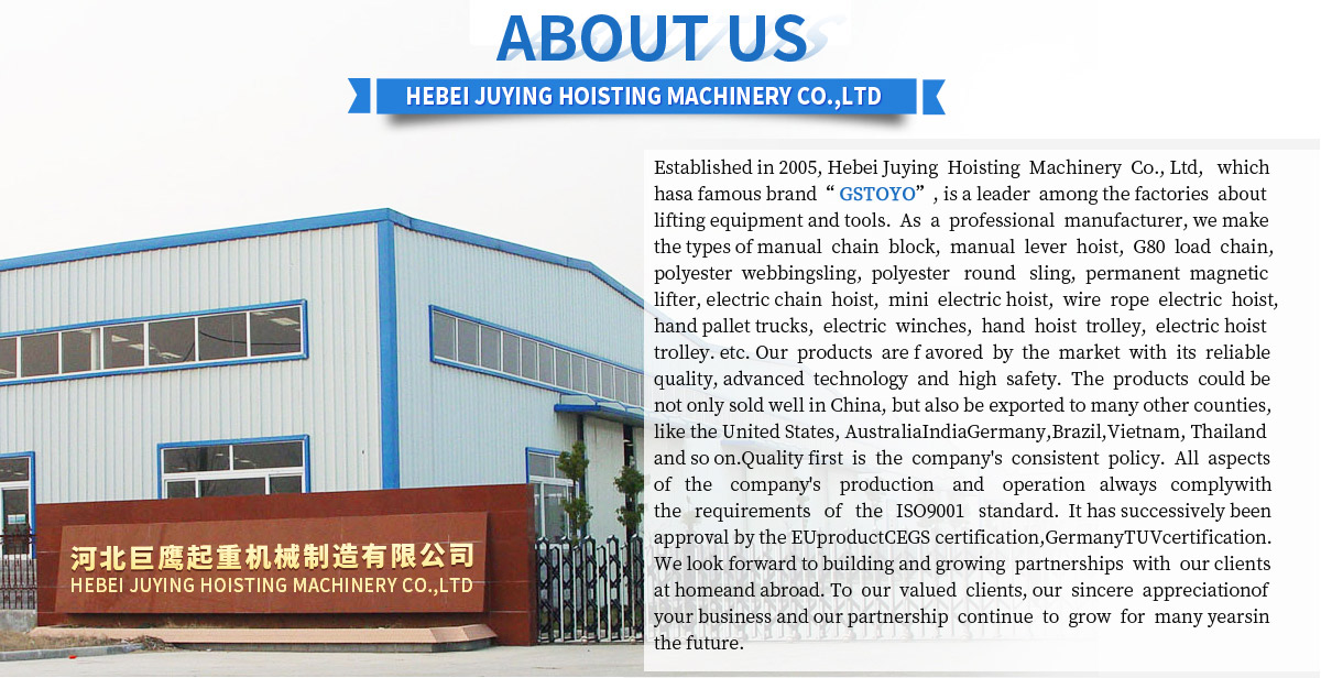Company: Hebei Juying Hoisting Machinery Co., Ltd. Address: Donglu Town, Qingyuan District, Baoding City, China, Postal Code: 071100 Tel: 0086-312-3071655 Whatsapp: +8615933590576 Skype: liujack1987 | ||||||||