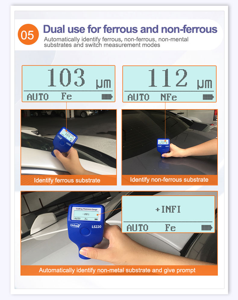 The automobile paint film meter, also known as the automobile paint film meter, is a special instrument for detecting the thickness of the surface coating of the automobile substrate. The automobile paint film meter can directly measure the sheet metal and spray paint of the car. It can also indirectly determine the degree of damage to the car. The LS220 car paint detector can identify metal putty and iron galvanized bodywork, as well as spot the car's iron, aluminum and non-ferrous substrates. This vehicle paint film thickness gauge has the characteristics of fast testing speed, stable test data, and high measurement accuracy.