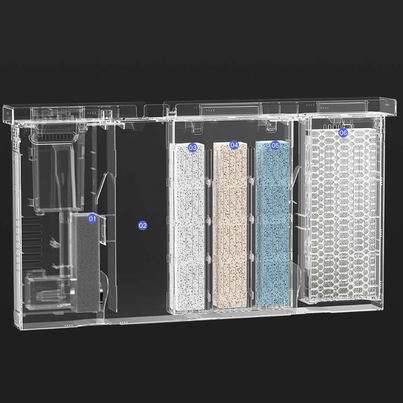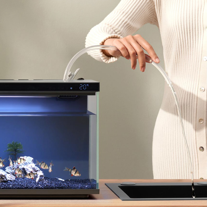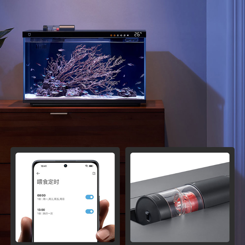 The Mijia smart fish tank adopts an integrated design that integrates water pumps, lights, feeders, fish tanks, filtration systems and temperature sensors. It requires no assembly and is ready to use. 16:9 golden widescreen ratio, ultra-white UHA glass, friction-resistant and corrosion-resistant, with a light transmittance of 91.3%. Built-in 5-layer professional compartment module post-filtration system, equipped with self-cleaning patented anti-clogging water pump, high-speed brushless motor drives 2-blade stainless steel rotating cutter head, which can effectively cut weeds, mucous membranes, floc and other impurities, effective physical filtration and bacteria Cultivation, quickly establishes the fish tank ecosystem and reduces the frequency of water changes. With the side suction pump, the water in the water tank can be drained through the drainage hole of the pump module, making it easy to drain the water with one click, without the need to carry the water tank back and forth. Supports remote automatic feeding, remote control using Mijia App, rotating anti-stuck food mixing and feeding bin, capacity 30mL. Full-color gamut ecological lamp, 24 high-definition LED white light beads and 16 full-color gamut RGB lamp beads, which can switch between white light, streamer, luminous, streamer, South American style and other modes.