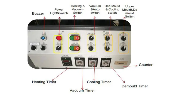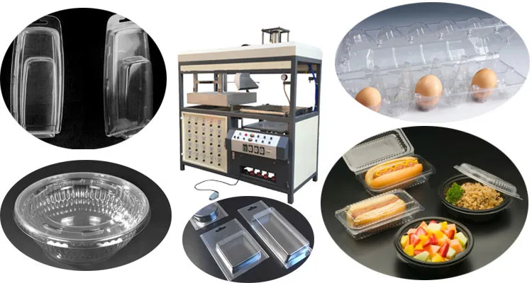 Suitable for PVC, PE, PET, PETG, PP, PC, PS, HIPS, APET etc, the machine furnace produce heat to soften the plastic sheet, then vacuum pump sucks the plastic sheet down to the forming mould area to finish the forming, different forming mould enable to have different forming shape. This machine is ideal for the sample making purpose and small quantity order production.