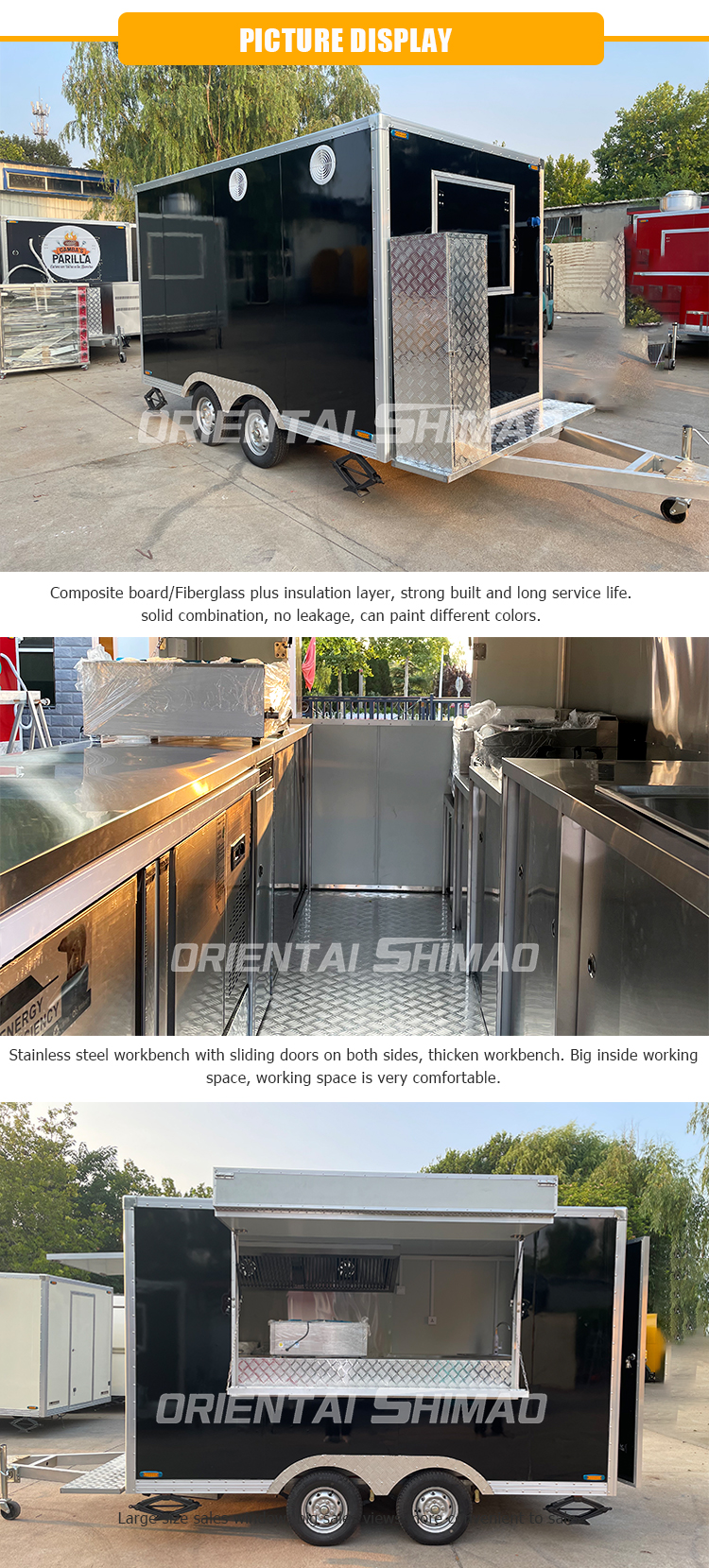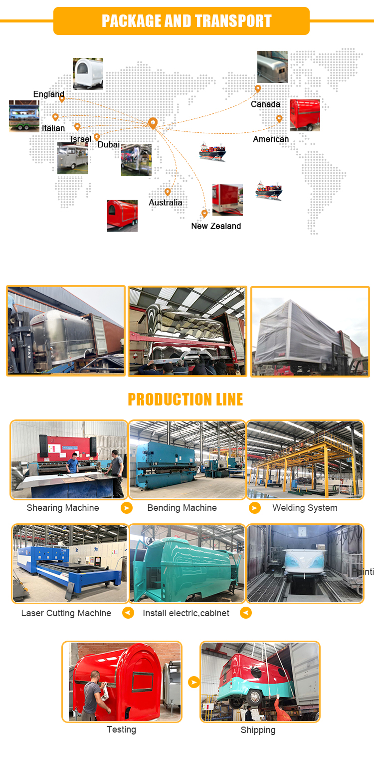 Standard configuration | 304 stainless steel workbench with cabinet. Sink, double water tank (clean water tank, waste water tank) Electrical system Mechanical brake and hand brake Tail light system |