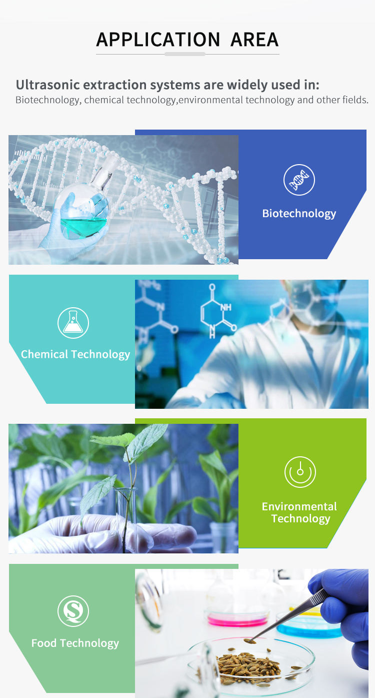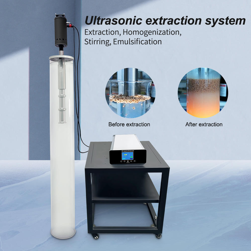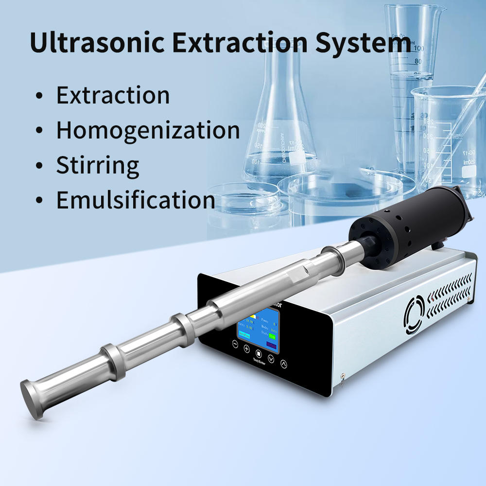 The CQ20 ultrasonic extraction system is an ultrasonic product matched with extraction equipment. The ultrasonic core accessories, consisting of an intelligent automatic frequency tracking ultrasonic generator, a high-Q high-power transducer, and a titanium alloy extraction tool head, have good performance in extraction, homogenization, stirring, emulsification, etc. The system has functions such as automatic frequency tracking, adjustable power, adjustable amplitude, and abnormal alarm. Equipped with RS485 communication, various parameters can be changed and observed through HMI.