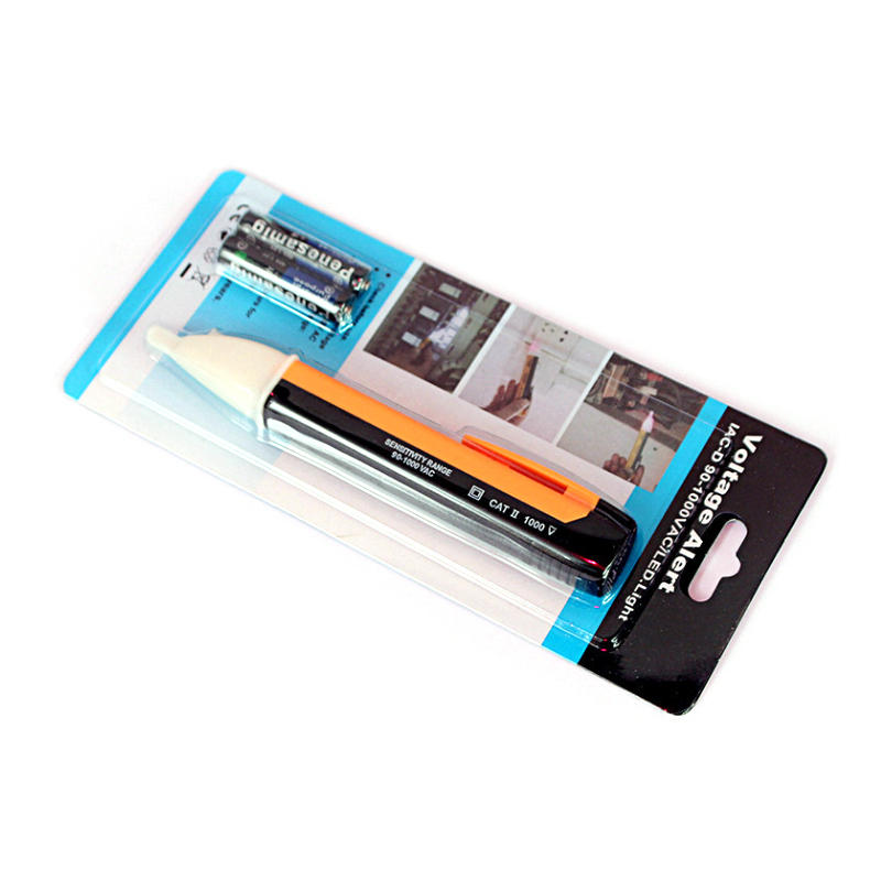 1. Frequency range: 50 to 500 Hz 2. Test voltage range: 90-1000V AC 3. Safety rating: CAT II 1000v 4. Power supply: 2 AAA batteries 5. Perfect tool kit for home and power industry use 6. Ideal design for testing power cords, circuit breakers, wall sockets, junction boxes, fuses, etc. 7. Just press the button and the white LED light will stay on when there is no voltage 8. "Beep" sound and red flashing LED indicate voltage is present 9. Fully insulated, no exposed metal or conductive parts 10. Long life, low power consumption 11. Small, safe, easy to carry