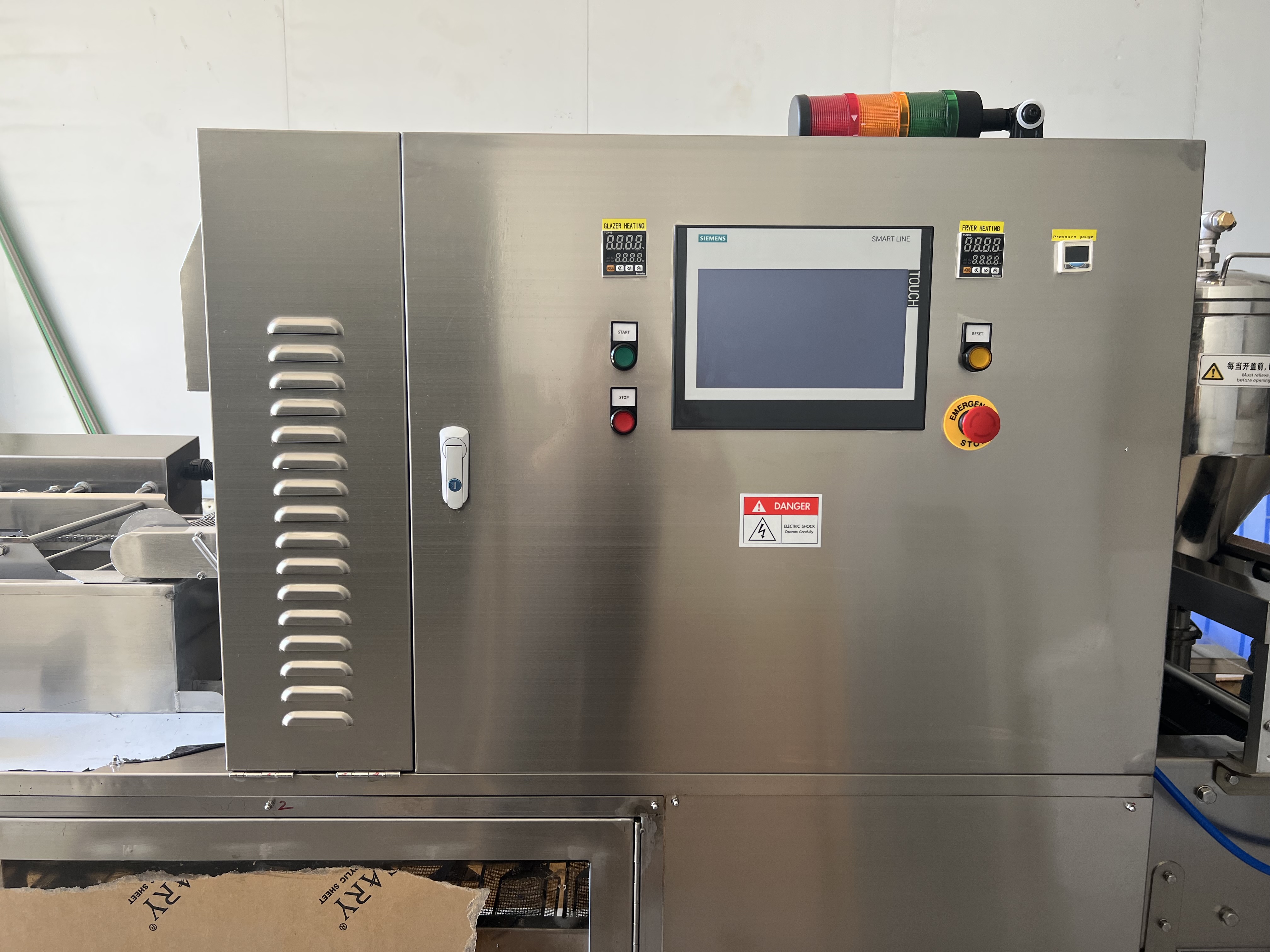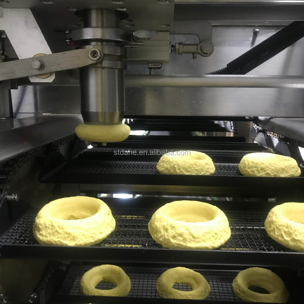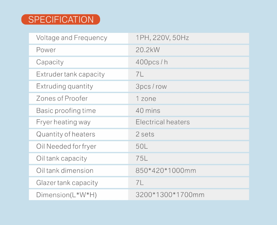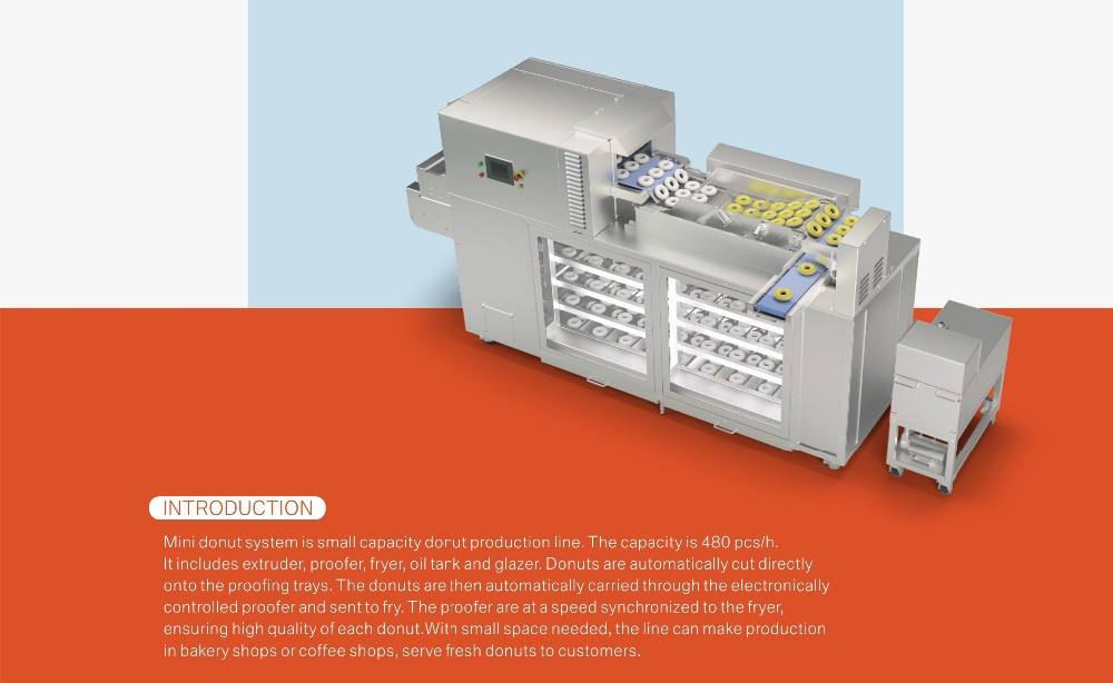 This machine is a small-capacity yeast donut production line that can produce 450-480 donuts/hour. It includes donut extruder, proofer, fryer and glaze machine. Donuts are cut directly onto proofing trays. The donuts are then automatically transported electronically. Proofer and sent to frying. The speed of the proofing machine and the frying machine are synchronized to ensure the high quality of each donut.