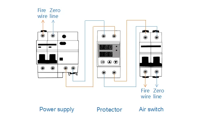 - This protector has no short-circuit protection function and it shall work with miniature circuit breaker. If the miniature circuit breaker is not used for protection, the short circuit current will not be broken when there is a short circuit fault at the input or output ends of the protector.