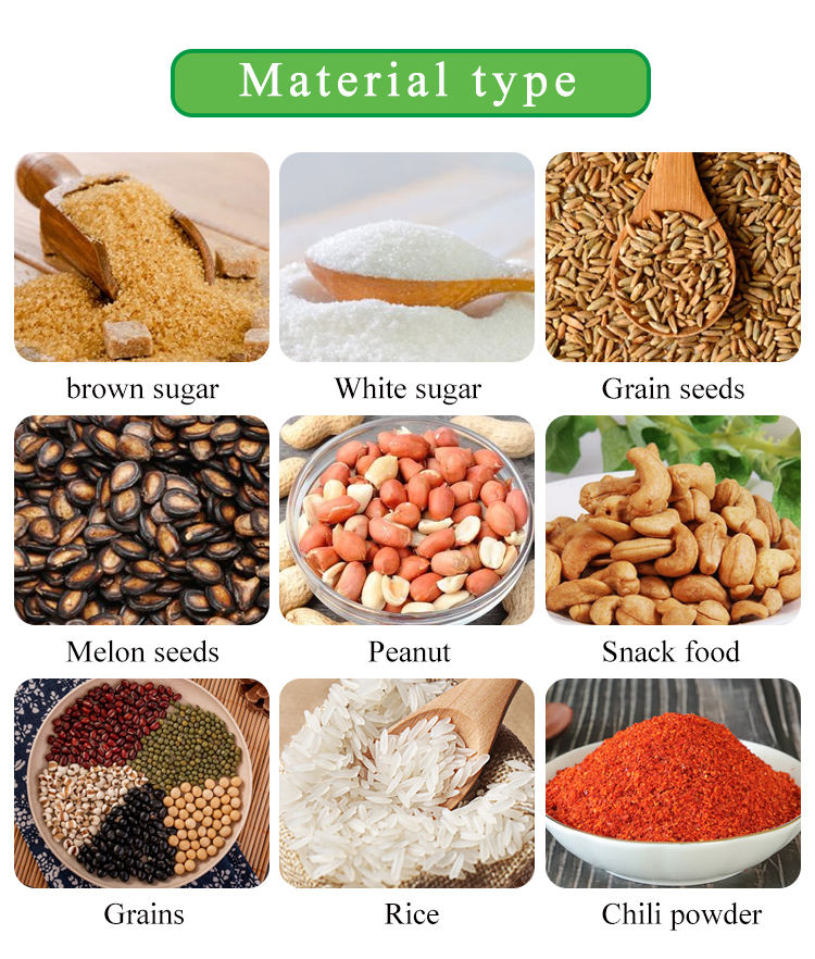 Food, dry powder, sugar, spices, granules, seeds, cereals, wheat, beans, etc.