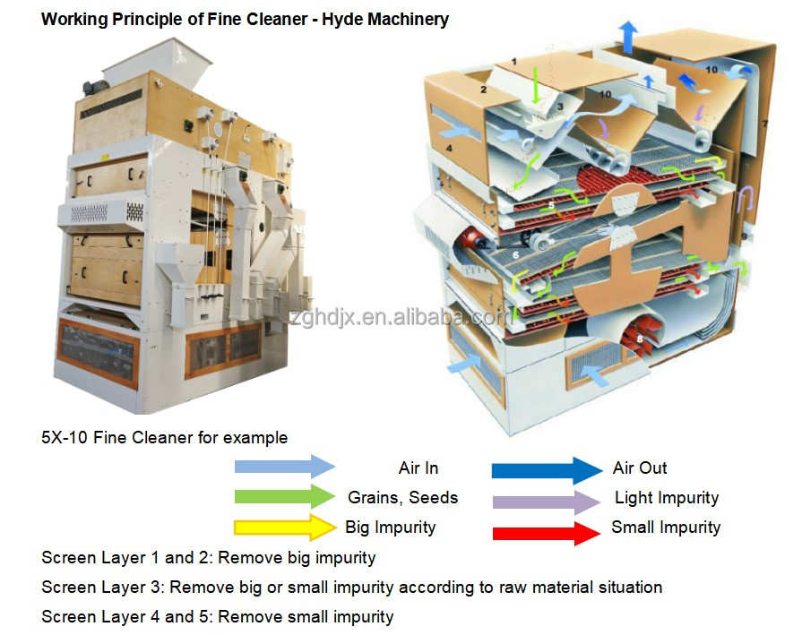 1) Function: Fine cleaning to remove impurities, broken grains and spoiled grains; classify seeds according to size.