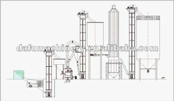 is composed of crusher, Raymond mill, lifter, dust remover, heat conductive oil furnace, Roots fan, material bin etc. And the system of boiling and calcination is the key link of the whole gypsum powder-making process.