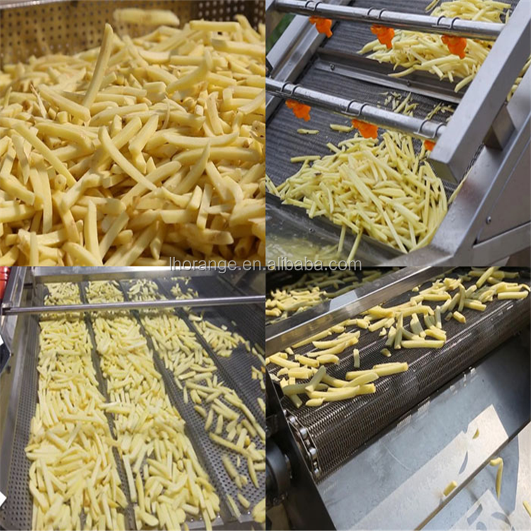 Potatoes - stone cleaning - peeling - inspection - cutting - grading - blanching - conditioning - drying - frying - de-oiling - pre-cooling - freezing - packaging - refrigeration