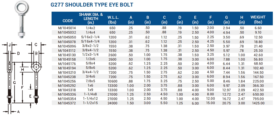 G277 shoulderNut eye boltThere is a shank for anchoring to a structure or equipment and a loop for attaching ropes, hooks, or other hardware. They are used as anchor eye bolts for routing or bundling wires and cables. Eyebolts are rated for vertical lifting to their specified capacity. Regular Nut Eyebolt G291 has a long shank and is primarily used as an anchor point for connecting wire rope and other rigging hardware to a fixed end point, but is used for straight pulls only.