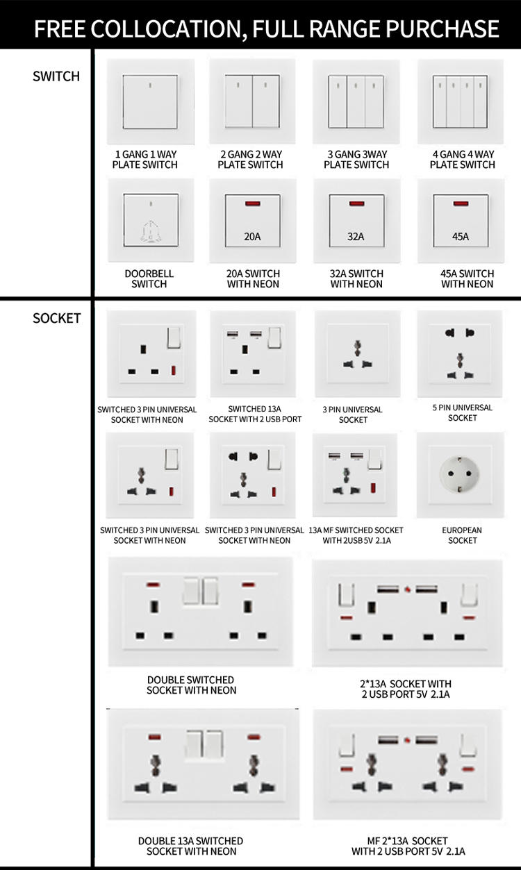 thing | Hot selling electrical accessories white British standard 220V 16A plug power socket light wall socket switch | ||||