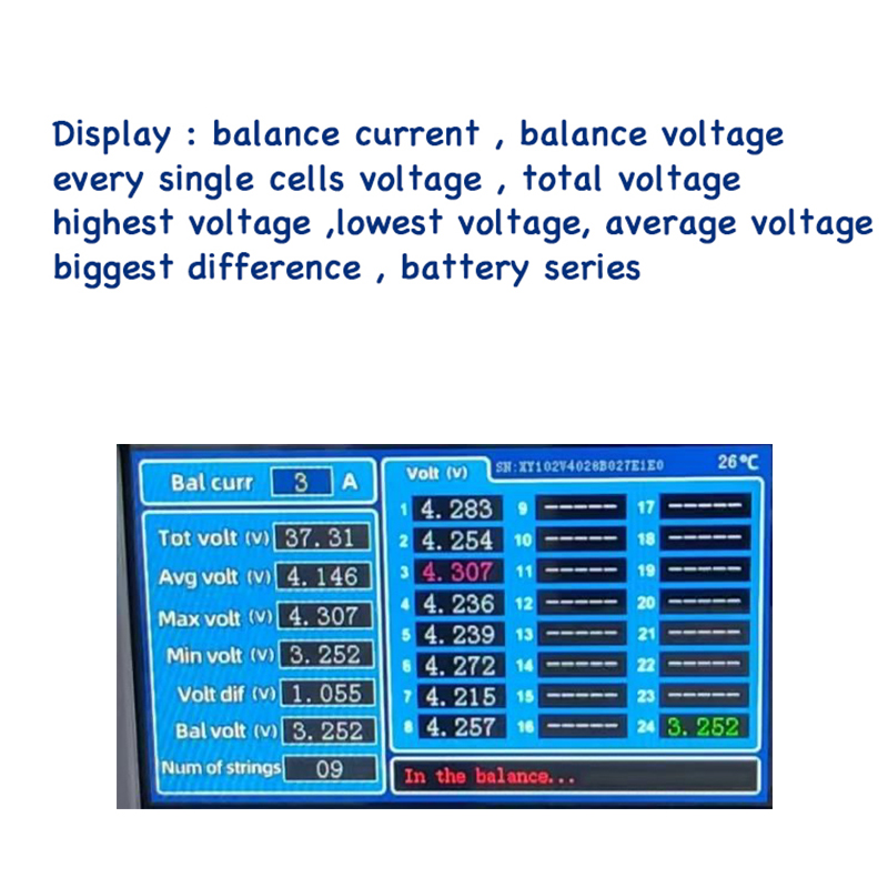 The display content is rich: balance current, balance voltage, single string voltage, total voltage, maximum voltage, minimum voltage, average voltage, maximum voltage difference, number of battery strings, etc.