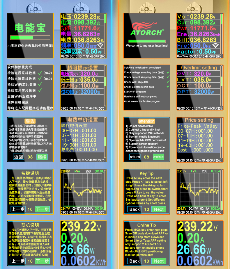 When the instrument is powered on for the first time, the built-in magnetic latching relay needs to be reset. During this period, it will turn on for more than ten seconds and maintain output (delay protection). Only after the startup is completed and the measurement interface is reached, the over-limit enablement (such as overvoltage, undervoltage, overcurrent, overpower and other protection functions take effect) and the normal working mode of the measurement data can be realized.