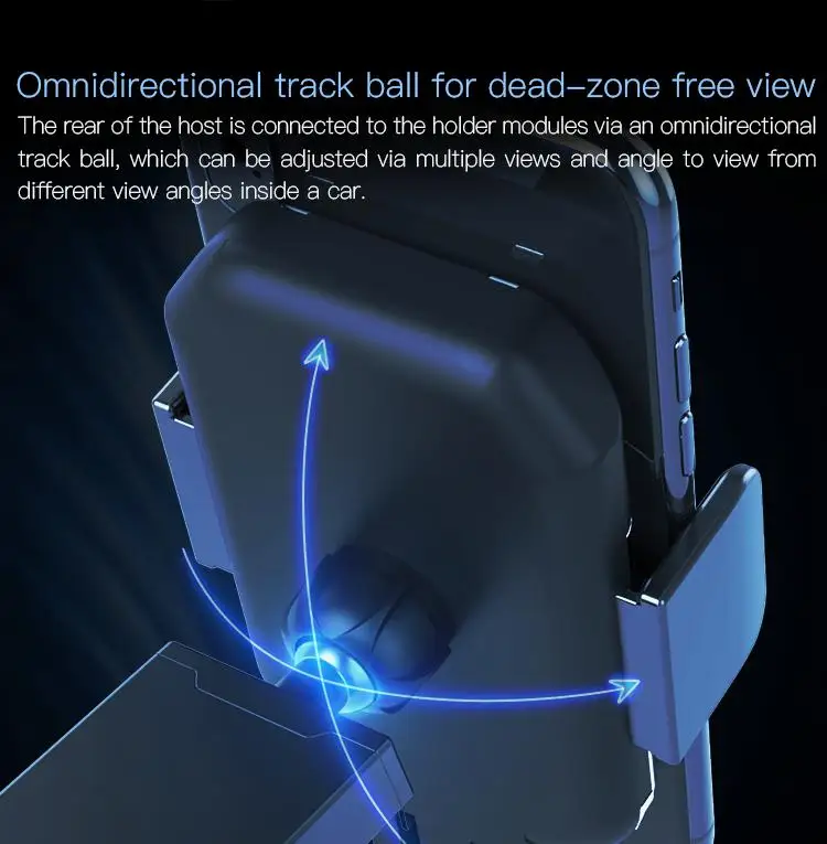 The rear of the host is connected to the holder modules via an omnidirectional track ball, which can be adjusted via multiple views and angle to view from different view angles inside a car.