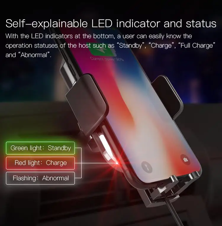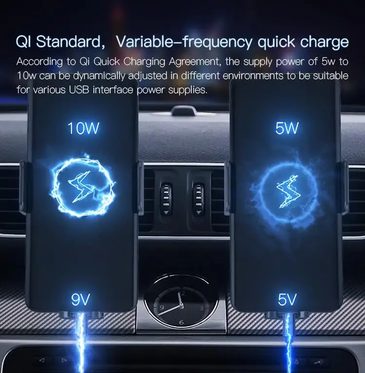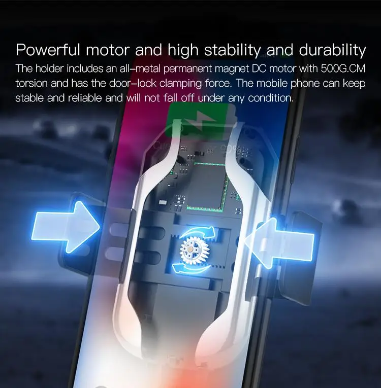 The holder includes an all-metal permanent magnet DC motor with 500G.CM torsion and has the door-lock clamping force. The mobile phone can keep stable and reliable and will not fall off under any condition.