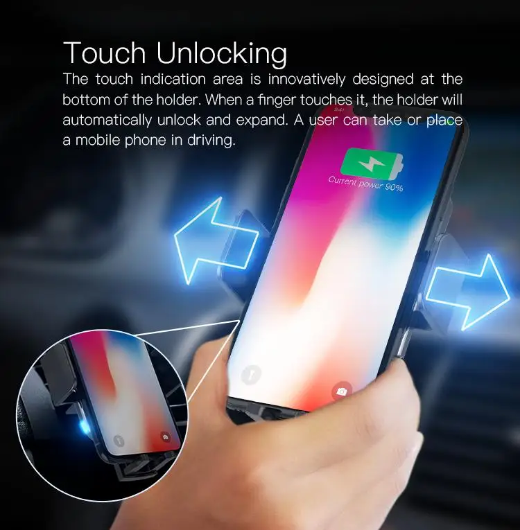 The touch indication area is innovatively designed at the bottom of the holder. When a finger touches it, the holder will automatically unlock and expand. A user can take or place a mobile phone in driving.