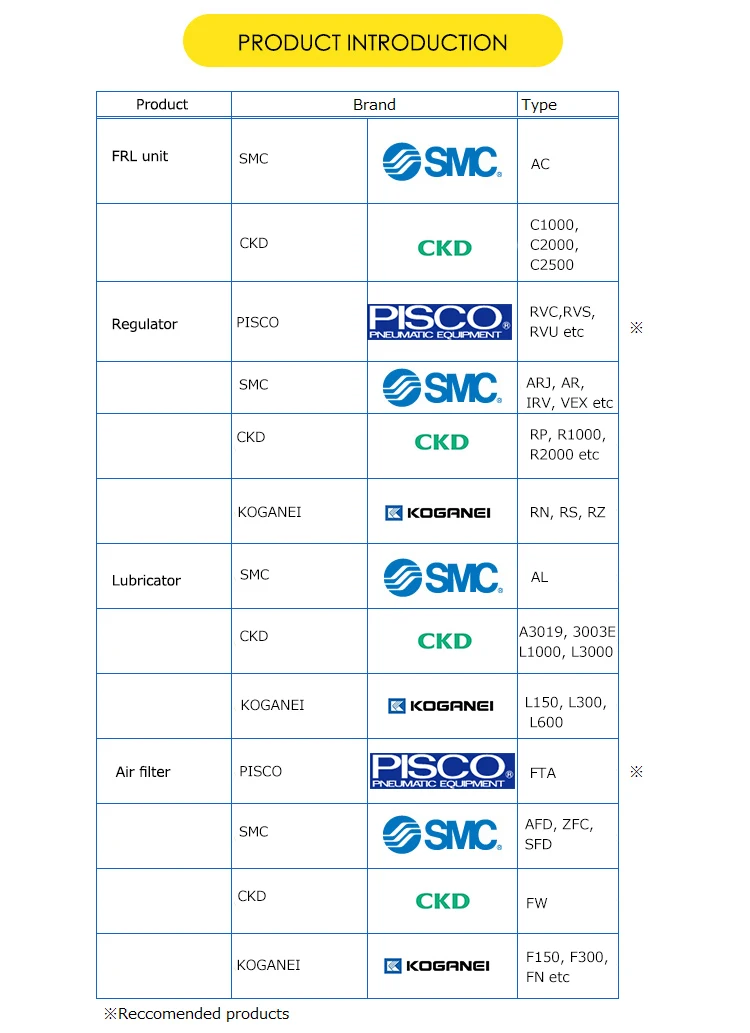 | Product Brand | PISCO, SMC, CKD, KOGANEI |