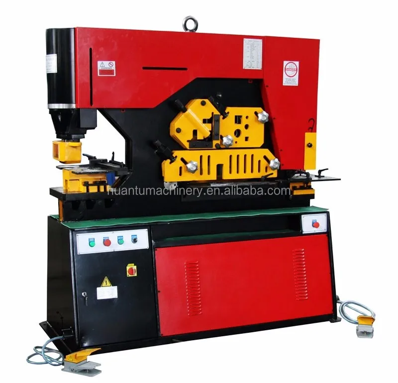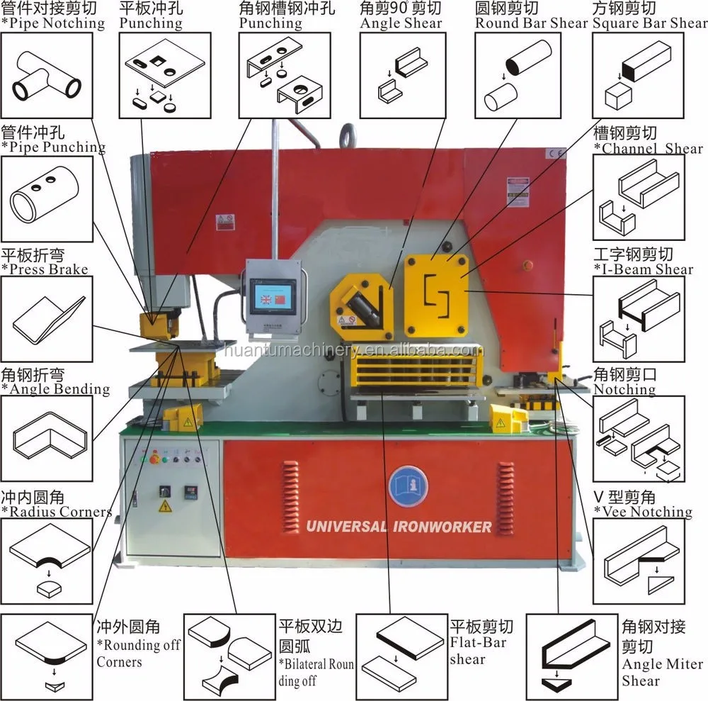 The multi functional iron worker(Q35series) can cut and punch all kinds of materials such as plate, square bar, angle, round bar, channel and so on. It has another special function, that is , it can also bend the plate below 500mm. With its multifunction, the machine is your first choice among the counterpart machine. All the components are of the highest quality in their safety , function, capability and maintenance.