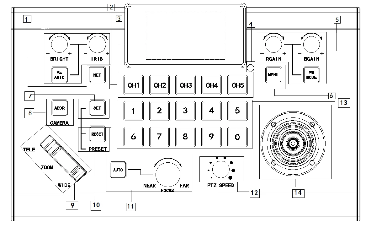 2.“CHANNEL” 1-5 number buttons, selection for camera control channel