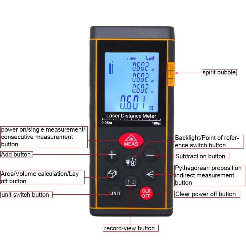Laser distance meter has a wide variety of applications in construction and industries.It is very useful and convenient to give accurate measurement of distance, area and volume especially in large areas such as rooms, apartments, buildings, real estates, factories, warehouses, gardens, roads, infrastructures.