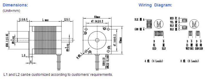 | Model No. | Step Angle (°) | Voltage /Phase (V) | Current /Phase (A) | Resistance /Phase (Ω) | Inductance Phase (mH) | Holding Torque (kg.cm) | Detent Torque (g.cm.Max) | Motor Length (mm) | Lead Wires No. | Motor Weight (kg) |