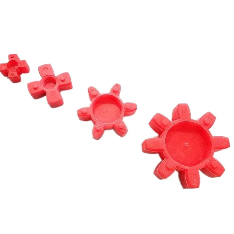 The curved jaw coupling includes two metal hubs and an elastomeric "spider" element. The spiders are available in