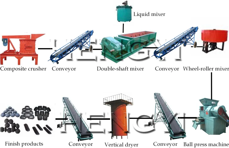Raw materials ---crushing---feeding---mixing---briquetting---drying---finished products