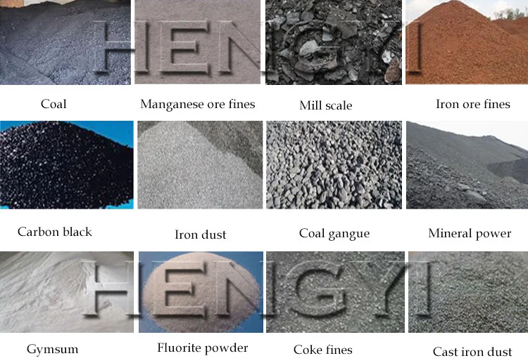 coal powder, charcoal powder, metallic powder (FeSi powder), iron scale, iron sludge, precipitator dust, iron concentrate, raw material powder, manganese ore fines, slime peat, fireproof material, desulfurized gypsum