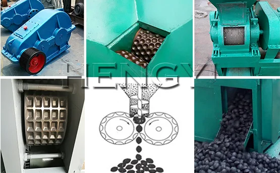 This series of charcoal and Coke powder briquette making machine will pass the power on to the two pressure roller through the reducer.The two sides and roll rotation, in both the rotating roll,Natural materials to enter the ballroll mode, with the roll rotation, material pressure on a small become larger, When the material to the two rollers rotating line contact point, the pressure of materials has reached the peak. Tremendous pressure in the role of line, the materials become a finished product from the powder ball.